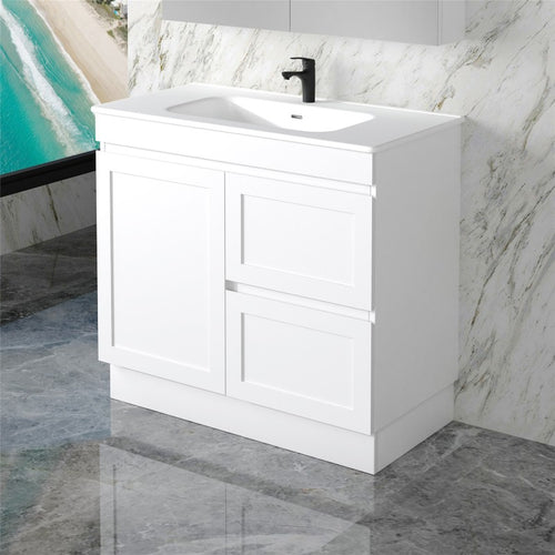 Noah 900mm Vanity on Kickboard Drawer System: Soft-close drawers and doors Storage: Two drawers and one cabinet Configuration: Option for dra...