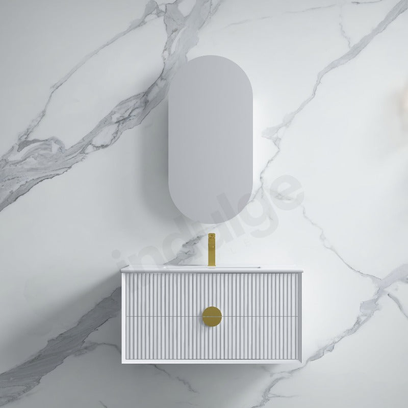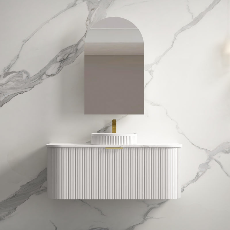 View full detailsRio 900 Curved Fluted Matte White Wall Hung Vanity 900 x 460 x 450mm Mounting: Wall Hung Stone Thickness: 20mm Colour: Fluted Matte White Drawe...