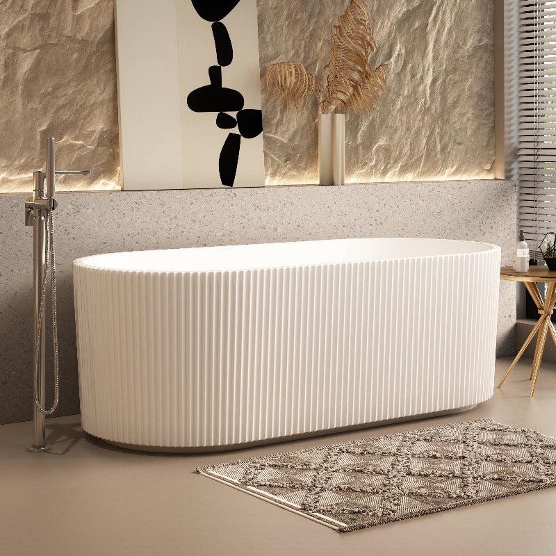 Kelsa Fluted Matte White Designer Round Freestanding Bath Australian Standard 1700 x 800 x 580mm Vertical Engraved V Groove Linear Lines Modern E...