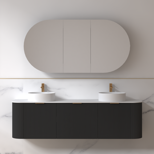 Siena 1800 Curved Double Matte Black Fluted Wall Hung Vanity Cabinet Size: 1790 x 455 x 480mm Cabinet Colour: Fluted Matte Black Internal Hidden...