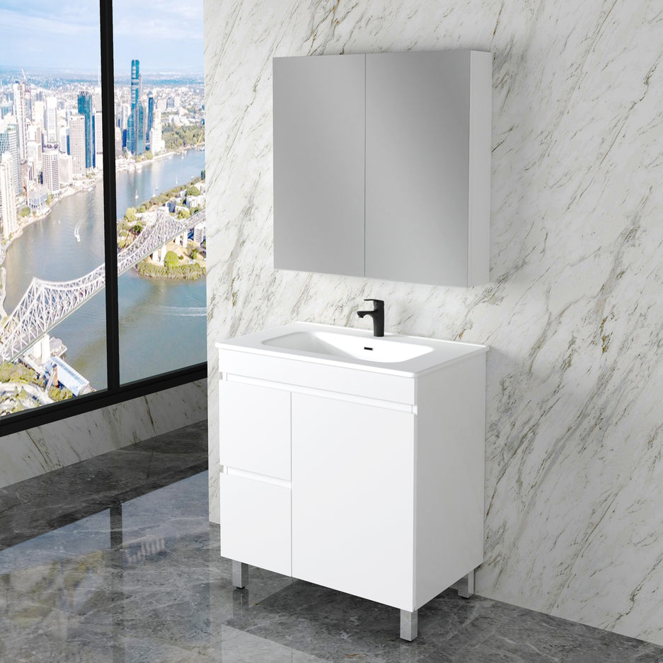 Miami Matte White Vanity with Kickboard – 750mm Dimensions: 750mm (W) x 460mm (D) x 820mm (H) Finish: Matte White Drawers: Available in Left ...
