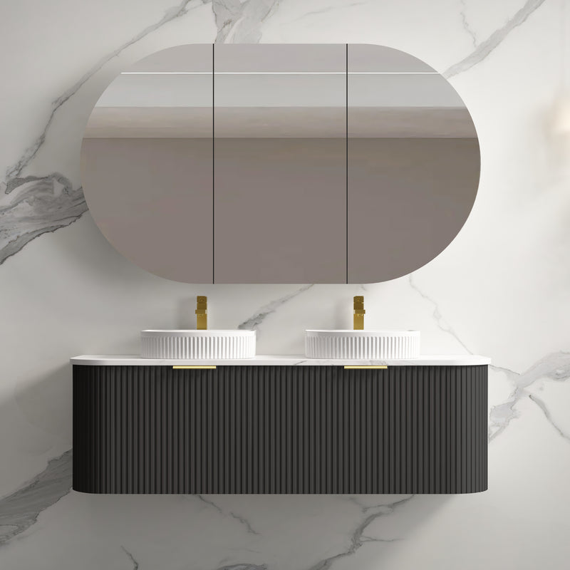 Rio 1500 Curved Fluted Matte Black Wall Hung Vanity 1500 x 460 x 450mm Mounting: Wall Hung Stone Thickness: 20mm Colour: Fluted Matte Black Dra...