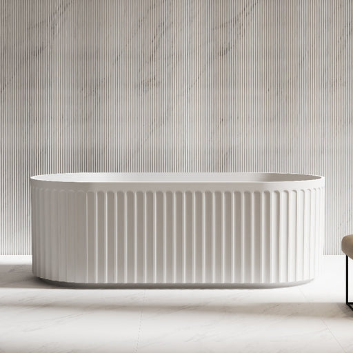 Kelsa Fluted Matte White Designer Round Freestanding Bath Australian Standard 1500 x 750 x 580mm Vertical Engraved V Groove Linear Lines Modern E...
