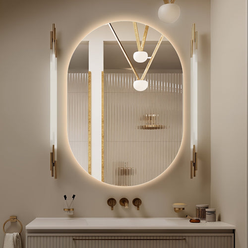 View full detailsOval Pill Touchless 900 x 600 Brushed Gold LED Mirror - Three Light Temperatures