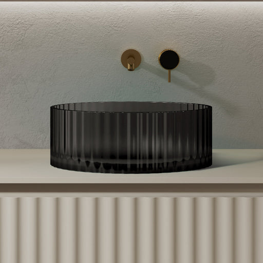 Avina 380mm Translucent Resin Stone Fluted Above Counter Basin Elevate your bathroom with the warm, glowing elegance of the Avina Black Basin. Craf...