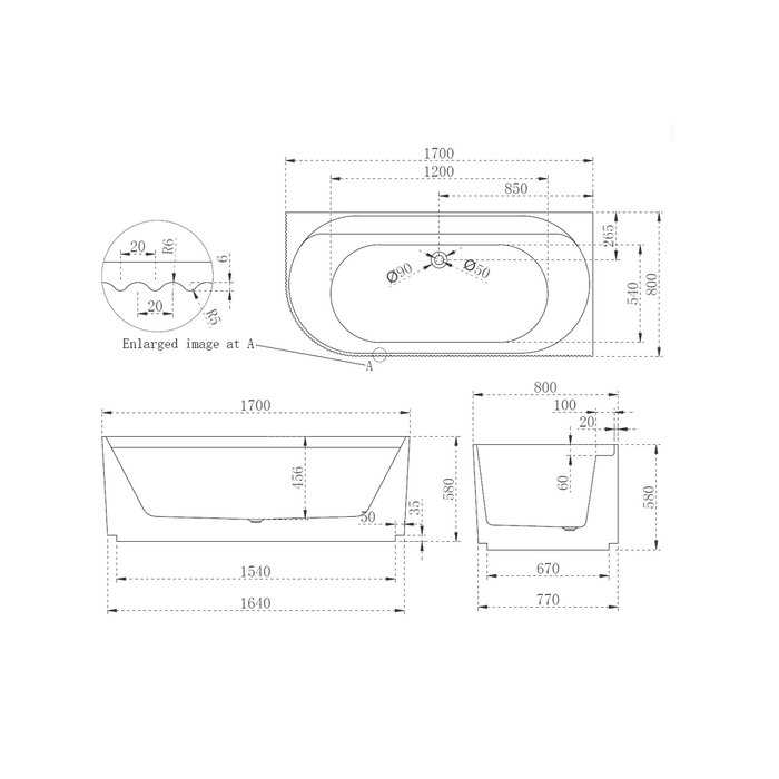 Pavilion Ribbed 1700mm Gloss White Right Corner Fit Freestanding Bath