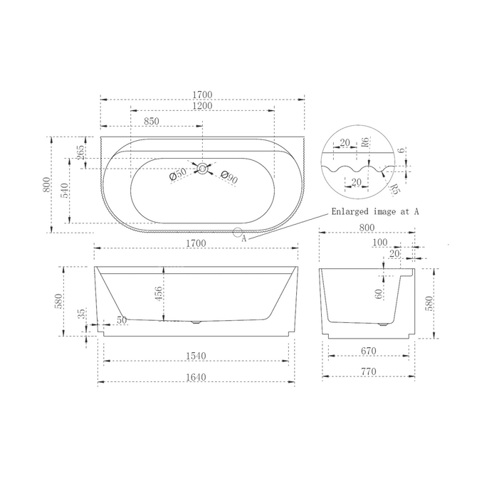 Waverly Ribbed 1700mm Gloss White Back to Wall Freestanding Bath